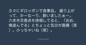 寺岡呼人 @yohito_teraoka – 0:38・2012年6月2日 2012 6/02 寺岡呼人 2012-06-02 久々にギロッポンで食事会。 盛り上がって、かーなーり、酔いましたぁー。 六本木交差点を徘徊してると、「おお、俺遊んでる」とちょっと気分が高揚(笑)。小っちゃいね(笑)。 Source:https://x.com/yohito_teraoka/status/20858337862... text X Post 寺岡呼人 寺岡呼人 この記事が気に入ったら フォローしてね! Follow @OtokoTimes1988 よかったらシェアしてね! URLをコピーしました! Koyo Maeda @koyomaeda - 19:36・2012年6月1日 寺岡呼人 @yohito_teraoka - 0:52・2012年6月2日 関連記事 Artist 寺岡呼人 1968.02.07