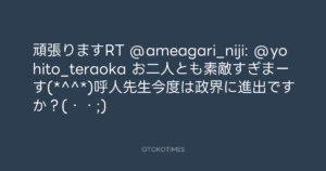 寺岡呼人 @yohito_teraoka – 18:28・2012年6月15日 2012 6/15 寺岡呼人 2012-06-15 頑張りますRT @ameagari_niji: @yohito_teraoka お二人とも素敵すぎまーす(*^^*)呼人先生今度は政界に進出ですか?(・・;) Source:https://x.com/yohito_teraoka/status/21356353078... text X Post 寺岡呼人 寺岡呼人 この記事が気に入ったら フォローしてね! Follow @OtokoTimes1988 よかったらシェアしてね! URLをコピーしました! 寺岡呼人 @yohito_teraoka - 16:36・2012年6月15日 青山英樹 @aoyama_hideki - 22:07・2012年6月15日 関連記事 Artist 寺岡呼人 1968.02.07