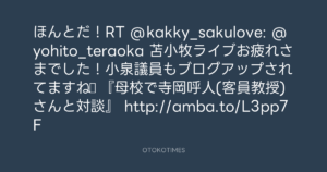 ほんとだ!RT @kakky_sakulove: @yohito_teraoka 苫小牧ライブお疲れさまでした!小泉議員もブログアップされてますね♪ 『母校で寺岡呼人(客員教授)さんと対談』 http://amba.to/L3pp7F