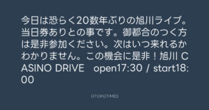 寺岡呼人 @yohito_teraoka – 10:18・2012年6月17日 2012 6/17 寺岡呼人 2012-06-17 今日は恐らく20数年ぶりの旭川ライブ。当日券ありとの事です。御都合のつく方は是非参加ください。次はいつ来れるかわかりません。この機会に是非!旭川 CASINO DRIVE open17:30 / start18:00 Source:https://x.com/yohito_teraoka/status/21416507446... text X Post 寺岡呼人 寺岡呼人 この記事が気に入ったら フォローしてね! Follow @OtokoTimes1988 よかったらシェアしてね! URLをコピーしました! 寺岡呼人 @yohito_teraoka - 10:10・2012年6月17日 寺岡呼人 @yohito_teraoka - 10:31・2012年6月17日 関連記事 Artist 寺岡呼人 1968.02.07