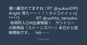 凄い量流れてますね!RT @yukari0904right 見たーー!!!カッコイイっっ(*^^*) RT @yohito_teraoka: 寺岡呼人CM出演情報! サントリーの新商品「ストーンズバー」本日から放映開始です。 http://www.youtube.com/SuntorySTONESBAR