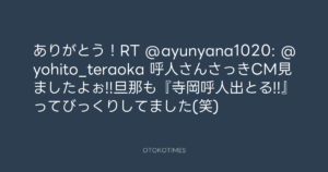 寺岡呼人 @yohito_teraoka – 1:01・2012年6月20日 2012 6/20 寺岡呼人 2012-06-20 ありがとう!RT @ayunyana1020: @yohito_teraoka 呼人さんさっきCM見ましたよぉ!!旦那も『寺岡呼人出とる!!』ってびっくりしてました(笑) Source:https://x.com/yohito_teraoka/status/21511203442... text X Post 寺岡呼人 寺岡呼人 この記事が気に入ったら フォローしてね! Follow @OtokoTimes1988 よかったらシェアしてね! URLをコピーしました! 寺岡呼人 @yohito_teraoka - 0:57・2012年6月20日 寺岡呼人 @yohito_teraoka - 1:02・2012年6月20日 関連記事 Artist 寺岡呼人 1968.02.07