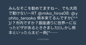 みんなそこを勧めてますねー、でも大雨で動けないーRT @mika_hiros08: @yohito_teraoka 熊本来てるんですか(^^)/?市内ですか?銀座通りに世界一になったピザがあるとききました♪♪しかし熊本といったら太ピー燕(*^^*)