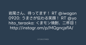寺岡呼人 @yohito_teraoka – 23:25・2012年6月24日 2012 6/24 寺岡呼人 2012-06-24 岩尾さん、待ってます! RT @iwagon0920: うまさが伝わる笑顔! RT @yohito_teraoka: くまモン焼酎、二杯目! http://instagr.am/p/MQgncjsflA/ Source:https://x.com/yohito_teraoka/status/21689983791... text X Post 寺岡呼人 寺岡呼人 この記事が気に入ったら フォローしてね! Follow @OtokoTimes1988 よかったらシェアしてね! URLをコピーしました! 寺岡呼人 @yohito_teraoka - 23:05・2012年6月24日 寺岡 呼人 @yohitoteraoka - 23:27・2012年6月24日(IG post) 関連記事 Artist 寺岡呼人 1968.02.07