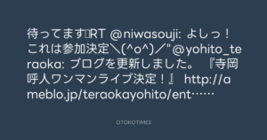 待ってます☆RT @niwasouji: よしっ!これは参加決定\(^o^)/”@yohito_teraoka: ブログを更新しました。 『寺岡呼人ワンマンライブ決定!』 http://ameblo.jp/teraokayohito/entry-11288268538.html”