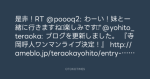 是非!RT @poooq2: わーい!妹と一緒に行きますね♪楽しみです☆”@yohito_teraoka: ブログを更新しました。 『寺岡呼人ワンマンライブ決定!』 http://ameblo.jp/teraokayohito/entry-11288268538.html”