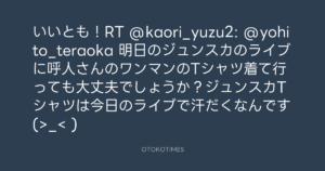 いいとも!RT @kaori_yuzu2: @yohito_teraoka 明日のジュンスカのライブに呼人さんのワンマンのTシャツ着て行っても大丈夫でしょうか?ジュンスカTシャツは今日のライブで汗だくなんです(>_< )
