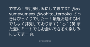ですね!来月楽しみにしてますRT @xxyumeyumexx @yohito_teraoka さっきはびっくりでしたー!最近お酒のCMでもよく拝見しております(´ω`)笑 また夏にミートでもお会いできるの楽しみにしてまーす♪