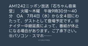 AM1242ニッポン放送「石ちゃん音楽堂」 火曜~木曜 午後9時30分~40分 OA 7月4日(水)から全4回にわたって、ゲストとして登場予定です。※ナイター中継延長によって、番組が休止になる場合があります。ご了承下さい。※パソコン・スマホからも!「ラジコ」と検索してみて下さい。