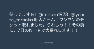 寺岡呼人 @yohito_teraoka – 0:42・2012年7月6日 2012 7/06 寺岡呼人 2012-07-06 待ってます☆RT @misuzu1973: @yohito_teraoka 呼人さーん!ワンマンのチケット取れました。うれしっ!!その前に、7日のNHKで大暴れします!! Source:https://x.com/yohito_teraoka/status/22090548111... text X Post 寺岡呼人 寺岡呼人 この記事が気に入ったら フォローしてね! Follow @OtokoTimes1988 よかったらシェアしてね! URLをコピーしました! 寺岡呼人 @yohito_teraoka - 0:39・2012年7月6日 寺岡呼人 @yohito_teraoka - 0:43・2012年7月6日 関連記事 Artist 寺岡呼人 1968.02.07