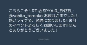 こちらこそ!RT @SPYAIR_ENZEL: @yohito_teraoka お疲れさまでした!熱いライブで、勉強になりました!!来月のイベントよろしくお願いします!!ほんとありがとうございました!