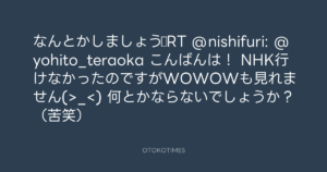 寺岡呼人 @yohito_teraoka – 12:23・2012年8月4日 2012 8/04 寺岡呼人 2012-08-04 なんとかしましょう☆RT @nishifuri: @yohito_teraoka こんばんは! NHK行けなかったのですがWOWOWも見れません(>_<) 何とかならないでしょうか?(苦笑) Source:https://x.com/yohito_teraoka/status/23159109889... text X Post 寺岡呼人 寺岡呼人 この記事が気に入ったら フォローしてね! Follow @OtokoTimes1988 よかったらシェアしてね! URLをコピーしました! 寺岡呼人 @yohito_teraoka - 12:22・2012年8月4日 寺岡 呼人 @yohitoteraoka - 12:38・2012年8月4日(IG post) 関連記事 Artist 寺岡呼人 1968.02.07