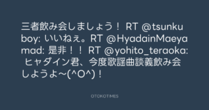三者飲み会しましょう! RT @tsunkuboy: いいねぇ。RT @HyadainMaeyamad: 是非!! RT @yohito_teraoka: ヒャダイン君、今度歌謡曲談義飲み会しようよ~(^O^)!