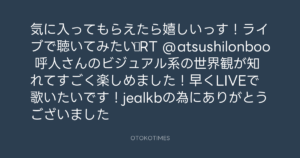 寺岡呼人 @yohito_teraoka – 8:58・2012年8月9日 2012 8/09 寺岡呼人 2012-08-09 気に入ってもらえたら嬉しいっす!ライブで聴いてみたい☆RT @atsushilonboo 呼人さんのビジュアル系の世界観が知れてすごく楽しめました!早くLIVEで歌いたいです!jealkbの為にありがとうございました Source:https://x.com/yohito_teraoka/status/23335149447... text X Post 寺岡呼人 寺岡呼人 この記事が気に入ったら フォローしてね! Follow @OtokoTimes1988 よかったらシェアしてね! URLをコピーしました! 寺岡呼人 @yohito_teraoka - 23:13・2012年8月8日 Koyo Maeda @koyomaeda - 12:56・2012年8月9日 関連記事 Artist 寺岡呼人 1968.02.07