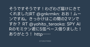 そうですそうです!わざわざ届けにきてくれました☆RT @gnkrmkn: おお!ムーンですね。きっかけはこの間の2マンですか? RT @yohito_teraoka: SPY AIRのモミケン君に5弦ベース借りました!ありがとう! http://t.co/hZEbP8zK