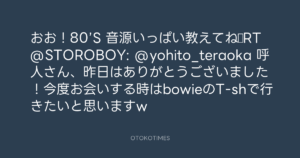 寺岡呼人 @yohito_teraoka – 13:41・2012年9月13日 2012 9/13 寺岡呼人 2012-09-13 おお!80’S 音源いっぱい教えてね☆RT @STOROBOY: @yohito_teraoka 呼人さん、昨日はありがとうございました!今度お会いする時はbowieのT-shで行きたいと思いますw Source:https://x.com/yohito_teraoka/status/24610621842... text X Post 寺岡呼人 寺岡呼人 この記事が気に入ったら フォローしてね! Follow @OtokoTimes1988 よかったらシェアしてね! URLをコピーしました! 寺岡呼人 @yohito_teraoka - 23:16・2012年9月12日 青山英樹 @aoyama_hideki - 14:13・2012年9月13日 関連記事 Artist 寺岡呼人 1968.02.07