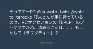 寺岡呼人 @yohito_teraoka – 14:18・2012年9月25日 2012 9/25 寺岡呼人 2012-09-25 そうですーRT @kuwata_twit: @yohito_teraoka 呼人さんが手に持っているのは、RCサクセションの「EPLP」のジャケですかね。清志郎さんは、、、もしかして「ラプソディー」? Source:https://x.com/yohito_teraoka/status/25046422320... text X Post 寺岡呼人 寺岡呼人 この記事が気に入ったら フォローしてね! Follow @OtokoTimes1988 よかったらシェアしてね! URLをコピーしました! 寺岡呼人 @yohito_teraoka - 13:08・2012年9月25日 寺岡 呼人 @yohitoteraoka - 14:27・2012年9月25日(IG post) 関連記事 Artist 寺岡呼人 1968.02.07