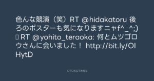 寺岡呼人 @yohito_teraoka – 12:21・2012年10月6日 2012 10/06 寺岡呼人 2012-10-06 色んな競演(笑)RT @hidakatoru 後ろのポスターも気になりますニャf^_^;)♬ RT @yohito_teraoka: 何とムツゴロウさんに会いました! http://bit.ly/OIHytD Source:https://x.com/yohito_teraoka/status/25442119194... text X Post 寺岡呼人 寺岡呼人 この記事が気に入ったら フォローしてね! Follow @OtokoTimes1988 よかったらシェアしてね! URLをコピーしました! 寺岡呼人 @yohito_teraoka - 10:08・2012年10月6日 寺岡 呼人 @yohitoteraoka - 19:40・2012年10月6日(IG post) 関連記事 Artist 寺岡呼人 1968.02.07
