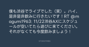 寺岡呼人 @yohito_teraoka – 23:37・2012年10月17日 2012 10/17 寺岡呼人 2012-10-17 僕も渋谷でライブでした(笑)。ハイ、是非是非飲みに行きたいです!RT @magumi1963: 11/22渋谷AXにスケジュールが空いてたら遊びに来てください。それがなくても今度飲みましょう! Source:https://x.com/yohito_teraoka/status/25857736645... text X Post 寺岡呼人 寺岡呼人 この記事が気に入ったら フォローしてね! Follow @OtokoTimes1988 よかったらシェアしてね! URLをコピーしました! 寺岡呼人 @yohito_teraoka - 23:30・2012年10月17日 寺岡呼人 @yohito_teraoka - 0:59・2012年10月18日 関連記事 Artist 寺岡呼人 1968.02.07