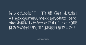 寺岡呼人 @yohito_teraoka – 0:20・2012年11月3日 2012 11/03 寺岡呼人 2012-11-03 待ってたのに(T_T)嘘(笑)またね!RT @xxyumeyumexx @yohito_teraoka お伺いしたかったです(´・ω・)取材のため行けず(´△`)お疲れ様でした! Source:https://x.com/yohito_teraoka/status/26438644187... text X Post 寺岡呼人 寺岡呼人 この記事が気に入ったら フォローしてね! Follow @OtokoTimes1988 よかったらシェアしてね! URLをコピーしました! 寺岡呼人 @yohito_teraoka - 23:01・2012年11月2日 青山英樹 @aoyama_hideki - 2:29・2012年11月3日 関連記事 Artist 寺岡呼人 1968.02.07