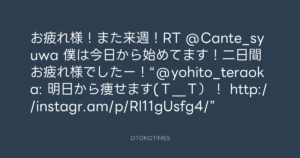 お疲れ様!また来週!RT @Cante_syuwa 僕は今日から始めてます!二日間お疲れ様でしたー!“@yohito_teraoka: 明日から痩せます(T_T)! http://instagr.am/p/Rl11gUsfg4/”