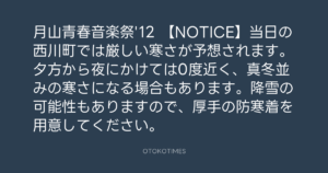 寺岡呼人 @yohito_teraoka – 15:49・2012年11月7日 2012 11/07 寺岡呼人 2012-11-07 月山青春音楽祭’12 【NOTICE】当日の西川町では厳しい寒さが予想されます。夕方から夜にかけては0度近く、真冬並みの寒さになる場合もあります。降雪の可能性もありますので、厚手の防寒着を用意してください。 Source:https://x.com/yohito_teraoka/status/26606972949... text X Post 寺岡呼人 寺岡呼人 この記事が気に入ったら フォローしてね! Follow @OtokoTimes1988 よかったらシェアしてね! URLをコピーしました! 寺岡呼人 @yohito_teraoka - 11:52・2012年11月7日 寺岡 呼人 @yohitoteraoka - 00:18・2012年11月8日(IG post) 関連記事 Artist 寺岡呼人 1968.02.07