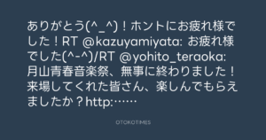 ありがとう(^_^)!ホントにお疲れ様でした!RT @kazuyamiyata: お疲れ様でした(^-^)/RT @yohito_teraoka: 月山青春音楽祭、無事に終わりました!来場してくれた皆さん、楽しんでもらえましたか?http://instagr.am/p/R4sh1csfsZ/