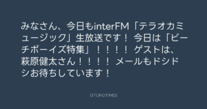 寺岡呼人 @yohito_teraoka – 20:33・2012年11月13日 2012 11/13 寺岡呼人 2012-11-13 みなさん、今日もinterFM「テラオカミュージック」生放送です! 今日は「ビーチボーイズ特集」!!!! ゲストは、萩原健太さん!!!! メールもドシドシお待ちしています! Source:https://x.com/yohito_teraoka/status/26831570867... text X Post 寺岡呼人 寺岡呼人 この記事が気に入ったら フォローしてね! Follow @OtokoTimes1988 よかったらシェアしてね! URLをコピーしました! 寺岡呼人 @yohito_teraoka - 16:08・2012年11月13日 寺岡呼人 @yohito_teraoka - 20:34・2012年11月13日 関連記事 Artist 寺岡呼人 1968.02.07