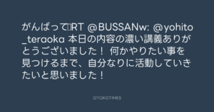 寺岡呼人 @yohito_teraoka – 19:33・2012年12月11日 2012 12/11 寺岡呼人 2012-12-11 がんばって☆RT @BUSSANw: @yohito_teraoka 本日の内容の濃い講義ありがとうございました! 何かやりたい事を見つけるまで、自分なりに活動していきたいと思いました! Source:https://x.com/yohito_teraoka/status/27844745138... text X Post 寺岡呼人 寺岡呼人 この記事が気に入ったら フォローしてね! Follow @OtokoTimes1988 よかったらシェアしてね! URLをコピーしました! 寺岡呼人 @yohito_teraoka - 16:49・2012年12月11日 寺岡呼人 @yohito_teraoka - 20:53・2012年12月11日 関連記事 Artist 寺岡呼人 1968.02.07
