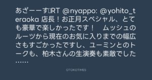 あざーーす☆RT @nyappo: @yohito_teraoka 店長!お正月スペシャル、とても豪華で楽しかったです! ムッシュのルーツから現在のお気に入りまでの幅広さもすごかったですし、ユーミンとのトークも、柏木さんの生演奏も素敵でした。