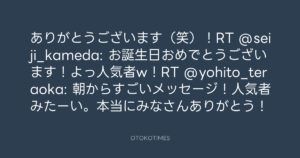 寺岡呼人 @yohito_teraoka – 9:28・2013年2月7日 2013 2/07 寺岡呼人 2013-02-07 ありがとうございます(笑)!RT @seiji_kameda: お誕生日おめでとうございます!🎉よっ人気者w!RT @yohito_teraoka: 朝からすごいメッセージ!人気者みたーい。本当にみなさんありがとう! Source:https://x.com/yohito_teraoka/status/29931376384... text X Post 寺岡呼人 寺岡呼人 この記事が気に入ったら フォローしてね! Follow @OtokoTimes1988 よかったらシェアしてね! URLをコピーしました! 寺岡呼人 @yohito_teraoka - 9:19・2013年2月7日 寺岡呼人 @yohito_teraoka - 9:40・2013年2月7日 関連記事 Artist 寺岡呼人 1968.02.07