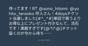 待ってます!RT @sono_hitomi: @yohito_teraoka 呼人さん!4daysチケット当選しました(#^_^#)単回で買うよりお得な上にプレゼント付きなんて、流石です!素敵すぎです(@^▽^@)チケット届くのが今から待ち遠しいです(*´▽`*)