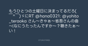 寺岡呼人 @yohito_teraoka – 0:32・2013年3月15日 2013 3/15 寺岡呼人 2013-03-15 もうひとつの土曜日に決まってるだろ( ̄^ ̄)ゞにRT @hana0321: @yohito_teraoka さん〜きゃぁ〜省吾さんの曲〜♪なにうたったんですか〜?聴きたぁ〜い! Source:https://x.com/yohito_teraoka/status/31222480395... text X Post 寺岡呼人 寺岡呼人 この記事が気に入ったら フォローしてね! Follow @OtokoTimes1988 よかったらシェアしてね! URLをコピーしました! 寺岡呼人 @yohito_teraoka - 0:07・2013年3月15日 寺岡 呼人 @yohitoteraoka - 00:39・2013年3月15日(IG post) 関連記事 Artist 寺岡呼人 1968.02.07