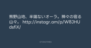 寺岡呼人 @yohito_teraoka – 10:11・2013年3月17日 2013 3/17 寺岡呼人 2013-03-17 熊野山地、半端ないオーラ。神々の宿る山々。 http://instagr.am/p/W8JHUdsfiX/ Source:https://x.com/yohito_teraoka/status/31309530577... text X Post 寺岡呼人 寺岡呼人 この記事が気に入ったら フォローしてね! Follow @OtokoTimes1988 よかったらシェアしてね! URLをコピーしました! 寺岡 呼人 @yohitoteraoka - 10:11・2013年3月17日(IG post) 寺岡 呼人 @yohitoteraoka - 12:20・2013年3月17日(IG post) 関連記事 Artist 寺岡呼人 1968.02.07