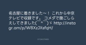 寺岡呼人 @yohito_teraoka – 12:21・2013年3月17日 2013 3/17 寺岡呼人 2013-03-17 名古屋に着きました〜! これから中京テレビで収録です。 コメダで腹ごしらえしてきました( ̄^ ̄)ゞ http://instagr.am/p/W8XzJXsfqH/ Source:https://x.com/yohito_teraoka/status/31312790819... text X Post 寺岡呼人 寺岡呼人 この記事が気に入ったら フォローしてね! Follow @OtokoTimes1988 よかったらシェアしてね! URLをコピーしました! 寺岡 呼人 @yohitoteraoka - 12:20・2013年3月17日(IG post) 寺岡呼人 @yohito_teraoka - 8:56・2013年3月18日 関連記事 Artist 寺岡呼人 1968.02.07