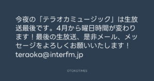寺岡呼人 @yohito_teraoka – 16:40・2013年3月26日 2013 3/26 寺岡呼人 2013-03-26 今夜の「テラオカミュージック」は生放送最後です。4月から曜日時間が変わります!最後の生放送、是非メール、メッセージをよろしくお願いいたします! teraoka@interfm.jp Source:https://x.com/yohito_teraoka/status/31645460705... text X Post 寺岡呼人 寺岡呼人 この記事が気に入ったら フォローしてね! Follow @OtokoTimes1988 よかったらシェアしてね! URLをコピーしました! 寺岡呼人 @yohito_teraoka - 12:50・2013年3月26日 寺岡 呼人 @yohitoteraoka - 19:57・2013年3月26日(IG post) 関連記事 Artist 寺岡呼人 1968.02.07