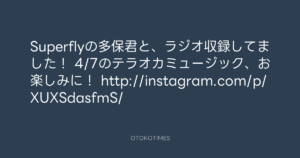 寺岡呼人 @yohito_teraoka – 20:00・2013年3月26日 2013 3/26 寺岡呼人 2013-03-26 Superflyの多保君と、ラジオ収録してました! 4/7のテラオカミュージック、お楽しみに! http://instagram.com/p/XUXSdasfmS/ Source:https://x.com/yohito_teraoka/status/31650484191... text X Post 寺岡呼人 寺岡呼人 この記事が気に入ったら フォローしてね! Follow @OtokoTimes1988 よかったらシェアしてね! URLをコピーしました! 寺岡 呼人 @yohitoteraoka - 19:57・2013年3月26日(IG post) 寺岡 呼人 @yohitoteraoka - 20:41・2013年3月26日(IG post) 関連記事 Artist 寺岡呼人 1968.02.07