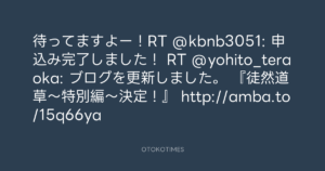 待ってますよー!RT @kbnb3051: 申込み完了しました! RT @yohito_teraoka: ブログを更新しました。 『徒然道草~特別編~決定!』 http://amba.to/15q66ya