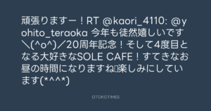 頑張りますー!RT @kaori_4110: @yohito_teraoka 今年も徒然嬉しいです\(^o^)/20周年記念!そして4度目となる大好きなSOLE CAFE!すてきなお昼の時間になりますね♪楽しみにしています(*^^*)