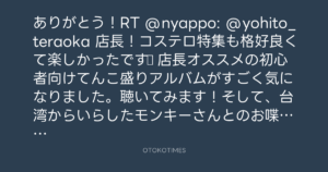 ありがとう!RT @nyappo: @yohito_teraoka 店長!コステロ特集も格好良くて楽しかったです♪ 店長オススメの初心者向けてんこ盛りアルバムがすごく気になりました。聴いてみます!そして、台湾からいらしたモンキーさんとのお喋りも楽しかったです!来週も楽しみです☆