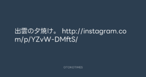 寺岡呼人 @yohito_teraoka – 18:35・2013年4月22日 2013 4/22 寺岡呼人 2013-04-22 出雲の夕焼け。 http://instagram.com/p/YZvW-DMftS/ Source:https://x.com/yohito_teraoka/status/32626804151... text X Post 寺岡呼人 寺岡呼人 この記事が気に入ったら フォローしてね! Follow @OtokoTimes1988 よかったらシェアしてね! URLをコピーしました! 寺岡 呼人 @yohitoteraoka - 18:35・2013年4月22日(IG post) 寺岡呼人 @yohito_teraoka - 19:08・2013年4月22日 関連記事 Artist 寺岡呼人 1968.02.07