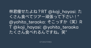 林君痩せたよね?RT @koji_hayasi: たくさん食べてツアー頑張って下さい!“@yohito_teraoka: そこっすか(笑)RT @koji_hayasi: @yohito_teraoka たくさん食べれるんですね。笑”