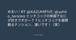 寺岡呼人 @yohito_teraoka – 10:48・2013年5月9日 2013 5/09 寺岡呼人 2013-05-09 めまい!RT @KAZUMIFIVE: @yohito_teraoka ヒッチコックの映画でなにが好きですか〜??ヒッチコックを昼間観るテンション、凄いです!(笑) Source:https://x.com/yohito_teraoka/status/33231098594... text X Post 寺岡呼人 寺岡呼人 この記事が気に入ったら フォローしてね! Follow @OtokoTimes1988 よかったらシェアしてね! URLをコピーしました! 寺岡呼人 @yohito_teraoka - 10:31・2013年5月9日 青山英樹 @aoyama_hideki - 22:16・2013年5月9日 関連記事 Artist 寺岡呼人 1968.02.07