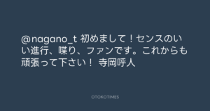 寺岡呼人 @yohito_teraoka – 11:14・2013年5月13日 2013 5/13 寺岡呼人 2013-05-13 @nagano_t 初めまして!センスのいい進行、喋り、ファンです。これからも頑張って下さい! 寺岡呼人 Source:https://x.com/yohito_teraoka/status/33376722640... text X Post 寺岡呼人 寺岡呼人 この記事が気に入ったら フォローしてね! Follow @OtokoTimes1988 よかったらシェアしてね! URLをコピーしました! 寺岡呼人 @yohito_teraoka - 22:54・2013年5月12日 寺岡呼人 @yohito_teraoka - 11:42・2013年5月13日 関連記事 Artist 寺岡呼人 1968.02.07