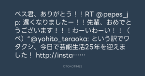 ペス君、ありがとう!!RT @pepes_jp: 遅くなりましたー!!先輩、おめでとうございます!!!わーいわーい!!(ペ)“@yohito_teraoka: という訳でワタクシ、今日で芸能生活25年を迎えました! http://instagram.com/p/ZkdFiQMfo1/”