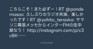 こちらこそ!また必ずー!RT @pondemasao: 久しぶりのラジオ共演、楽しかったです!RT @yohito_teraoka: サマソニ幕張メッセからインターFMの生中継なう! http://instagram.com/p/c3cBK3sfqz/
