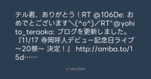 テル君、ありがとう!RT @106De: おめでとございます\(^o^)/RT“@yohito_teraoka: ブログを更新しました。 『11/17 寺岡呼人デビュー記念日ライブ ~20祭~ 決定!』 http://amba.to/15dOTau”