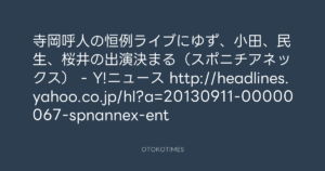 寺岡呼人の恒例ライブにゆず、小田、民生、桜井の出演決まる(スポニチアネックス) – Y!ニュース http://headlines.yahoo.co.jp/hl?a=20130911-00000067-spnannex-ent