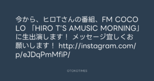 寺岡呼人 @yohito_teraoka – 10:17・2013年9月12日 2013 9/12 寺岡呼人 2013-09-12 今から、ヒロTさんの番組、FM COCOLO 「HIRO T’S AMUSIC MORNING」に生出演します! メッセージ宜しくお願いします! http://instagram.com/p/eJDqPmMfiP/ Source:https://x.com/yohito_teraoka/status/37796408516... text X Post 寺岡呼人 寺岡呼人 この記事が気に入ったら フォローしてね! Follow @OtokoTimes1988 よかったらシェアしてね! URLをコピーしました! 寺岡 呼人 @yohitoteraoka - 10:13・2013年9月12日(IG post) 青山英樹 @aoyama_hideki - 11:18・2013年9月12日 関連記事 Artist 寺岡呼人 1968.02.07