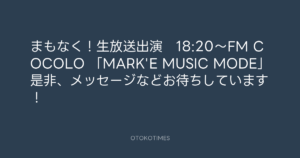 まもなく!生放送出演 18:20~FM COCOLO 「MARK’E MUSIC MODE」是非、メッセージなどお待ちしています!